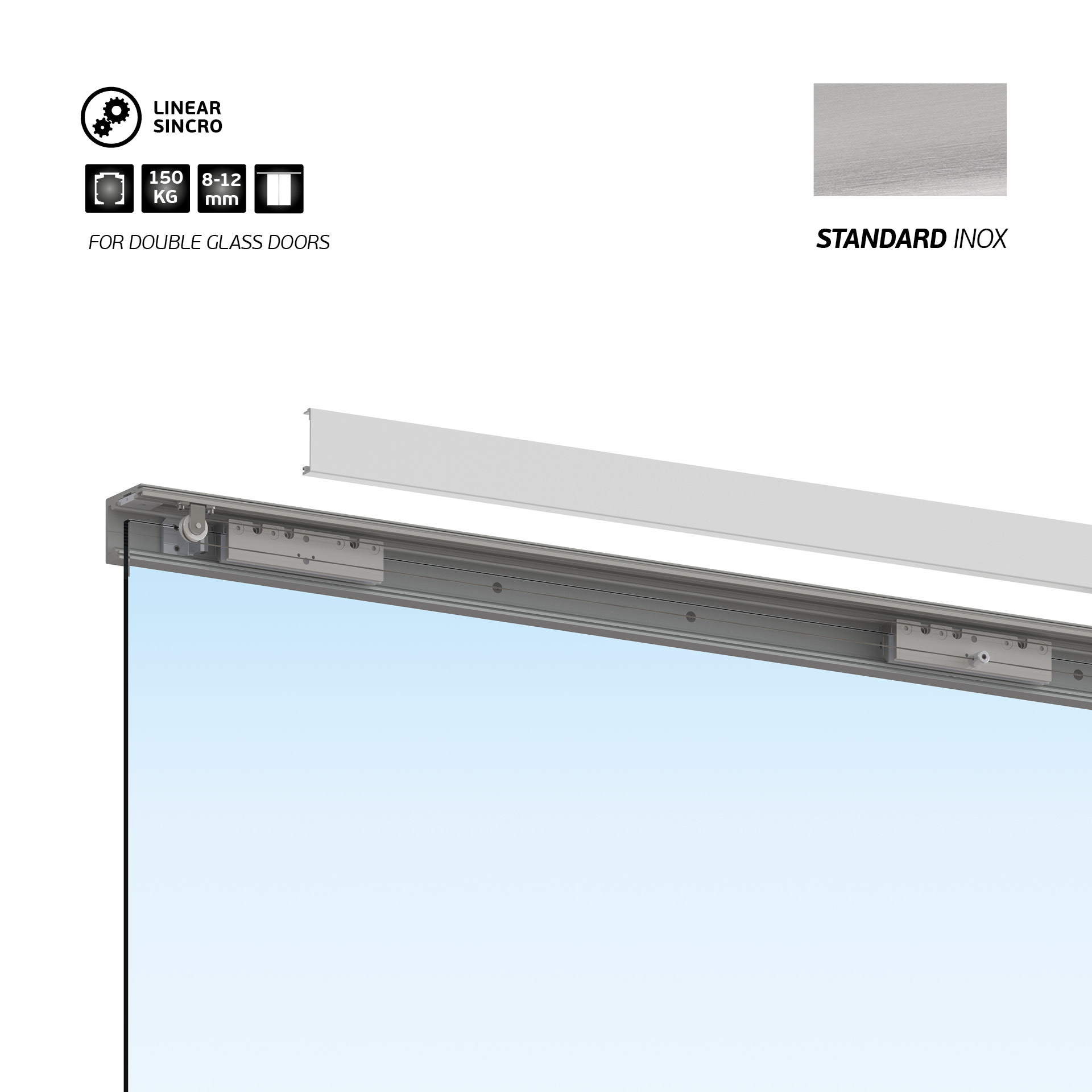 In the synchronised double door system the doors open and close simultaneously being manually operated. A stainless steel cable is responsible for transmitting movements. The sliding of the doors is smooth and creates a sensation of transparent movement.